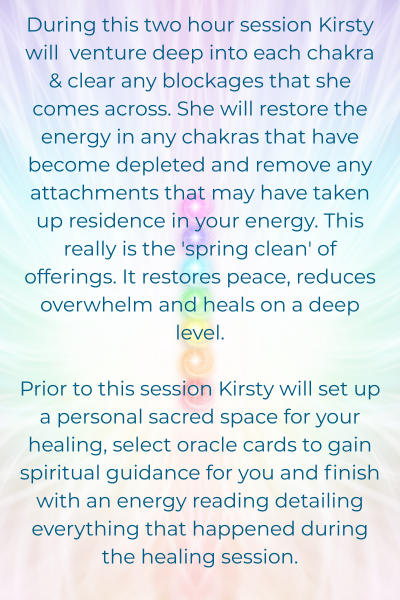 Kirsty will message you 15 minutes before she begins her work, and again once she has finished your session. She will follow up your session with a voice message explaining what she felt within each chakra so that you get clarity and fully understand what happened during the session. Kirsty will then send across a photo of the sacred space and the oracle cards and their meanings, for those sessions that have this feature included.