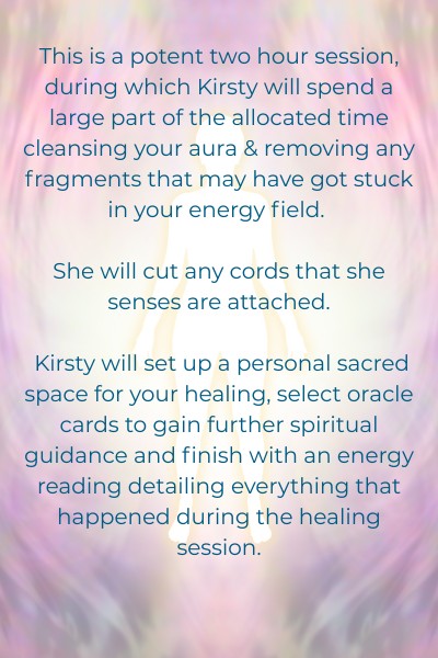 Before the session starts, a sacred space (similar to the image shown) will be created for you. As part of the session Kirsty will select a couple of oracle cards so that you also get a message that is personal to you. As a connection is made, the space will be filled with the vibrational energy that is specific to you and then she will begin to tune in on a deeper level to connect with your energetic body. The healing is non intrusive. Kirsty cannot see or hear thoughts or actions, she works entirely on blocked or depleted energy channels.